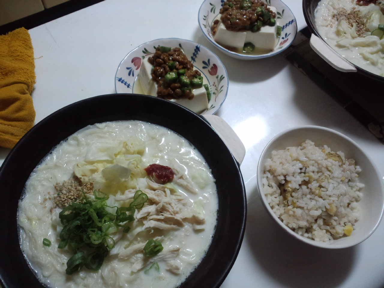 夏に余らせたそうめんに白湯スープ…がなかったので、ウエイパーと豆乳で作ったスープに鶏ササミとネギと白ゴマとキャベツ、梅干し!?でトッピング